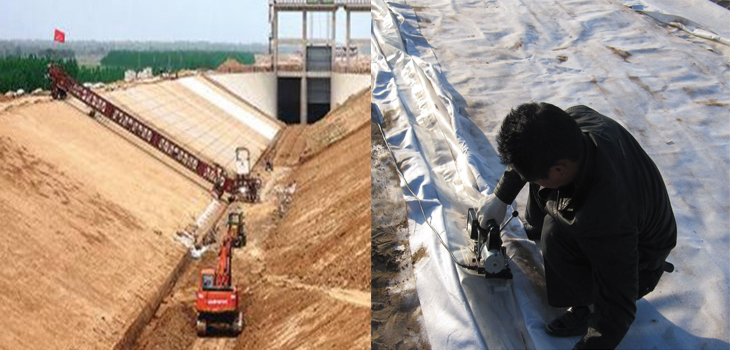 土工膜在搬運過程防止尖銳物體損傷膜;膜的裁剪寬度是根據(jù)坡面長度加上溝槽深寬度和上坡面水平面的壓實寬度,根據(jù)蓄水深度用勾股定理計算坡面長度,一般溝槽埋壓40cm,水平面壓30cm即可,三者相加即裁剪寬度,現(xiàn)場裁剪施工時場地要平整,同時避免有風雨天氣,由于池塘周長的關系,一般都需進行拼接,拼接方法有焊接、縫接、粘接三種,焊接需要有專業(yè)焊接機和專業(yè)人員施工,粘接需要特殊膠粘劑,兩者在現(xiàn)場施工較為繁瑣,實際操作基本采用縫接方法,用聚乙烯線機器或手工縫接即可,縫接采取相嵌式。