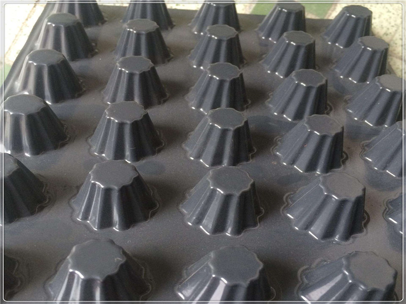 利用工藝壓型在土工膜上壓出封閉突起的圓臺狀、柱狀、球冠狀殼體,形成的一種膜、殼連續,具有立體空間和一定支撐剛度。結合表面鋪貼的無紡土工布濾水層。構架出架空層,利用架空層形成排水、排氣通道,同樣利用架空層達到隔音、隔振的功能。