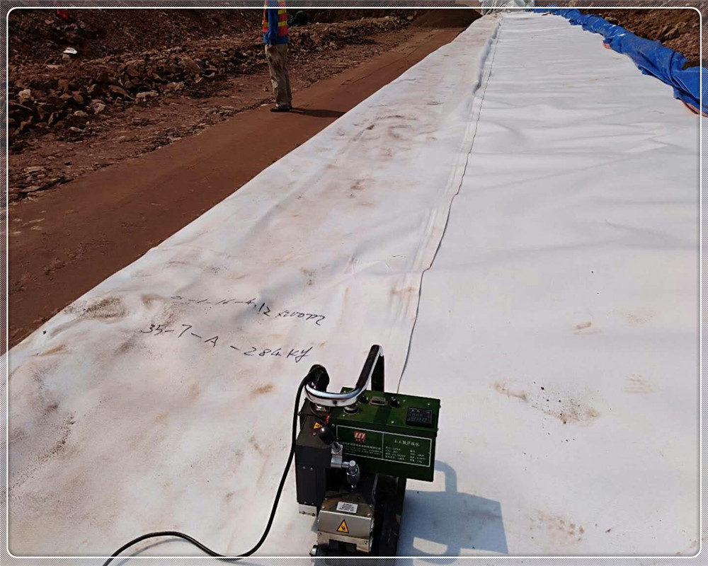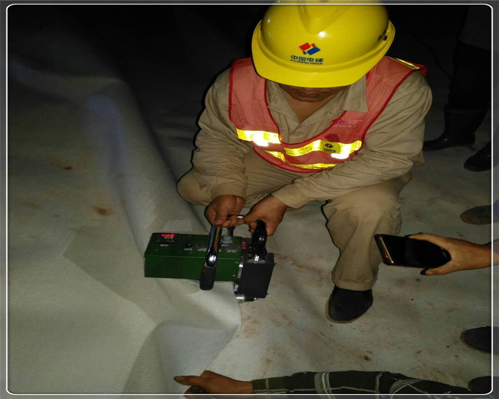 樞紐主要由復(fù)合土工膜堆石壩、溢洪道、引水發(fā)電系統(tǒng)、放空洞組成。復(fù)合土工膜堆石壩壩高85m,為高比例(達(dá)81%)軟巖填筑,軟巖填筑比例在同類型壩中世界之高。大壩防滲體采用復(fù)合土工膜防滲面板。土工膜之間的焊接和土工膜在錨帶部位的焊接,兩部位均采用熱風(fēng)粘合的方式。土工膜與土工膜之間的焊接采用全自動(dòng)風(fēng)焊機(jī)進(jìn)行,焊接帶的寬度為65mm,中間留有15mm的檢查氣孔,兩側(cè)各有25mm寬的粘合段。